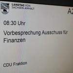Seit 10:00 Uhr tagt der Finanzausschuss des Landtages zum 8. mal. Die Arbeit beginnt wie üblich um 8:30 mit der Arbeitsgruppensitzung Finanzen der CDU-Fraktion im Landtag von Sachsen-Anhalt und der Koalitionsrunde der Finanzpolitiker.